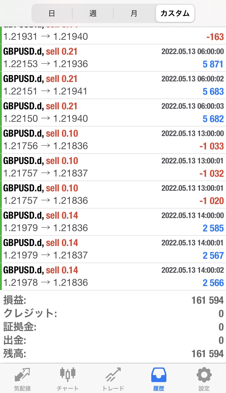 スコーピオン検証(2022年5月9日~5月13日) 検証 Twitter Facebook はてブ Pocket LINE コピー 2022.05.14 【週報】2022年5月9日~5月13日:161,594円(週利:+16.1%)(※100万円証拠金によるロット設定)