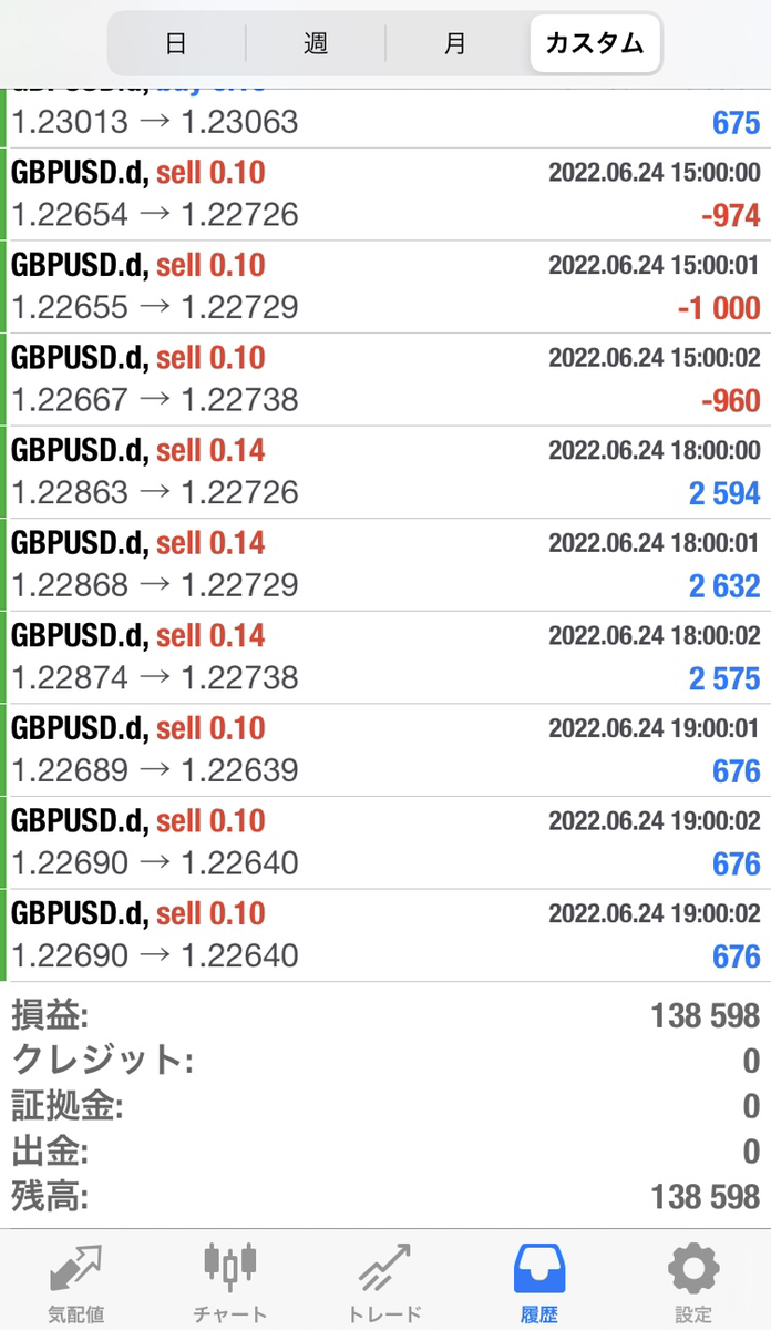 スコーピオン検証(2022年6月20日~6月24日) 検証 Twitter Facebook はてブ Pocket LINE コピー 2022.06.25 【週報】2022年6月20日~6月24日:138,598円(週利:+13.8%)(※100万円証拠金によるロット設定)